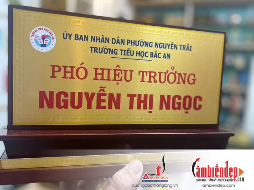 Một tấm biển chức danh sắc nét, sáng bóng đặt trên bàn làm việc không chỉ cung cấp thông tin, đó còn thể hiện phong thái của người lãnh đạo. Chúng tôi cung cấp đầy đủ từ dòng Mica kẹp thay tên tiện lợi đến các dòng gỗ đồng cao cấp lấy ngay.